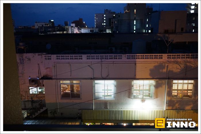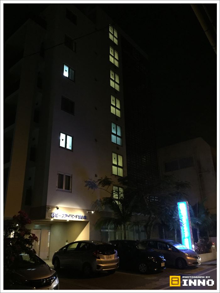 いつも夜に気づいてたので、夜撮った「ピースアイルランド宮古島」の外見です。