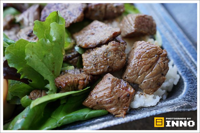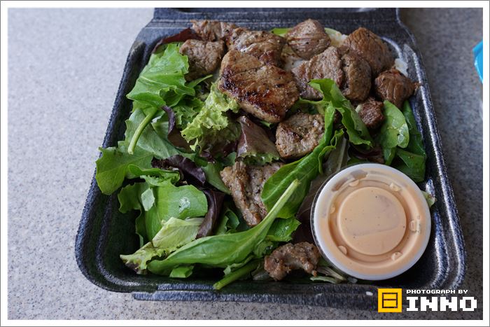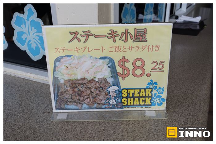 一番人気のステーキプレートにご飯とサラダ付きで$8.25だと書いてあります。