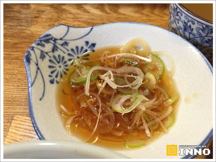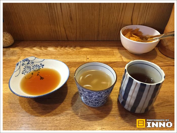 から揚げ定食を注文するとお茶とスープとソースをくれます。