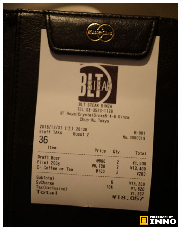 この「フィレミニヨン・コース」を2人前とビールを2つ飲んでサービス料10%、消費税8%を入れて合計が18057円になりました。