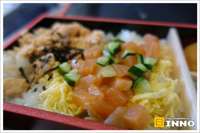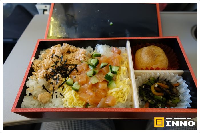 これがJL957便の機内食「サーモン丼」です。