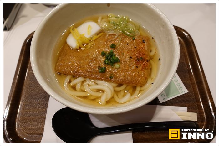 成田空港の第1ターミナルの中央ビル5Fにあるうどん専門店「自家製麺 杵屋麦丸」のきつねうどんです。