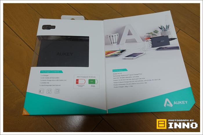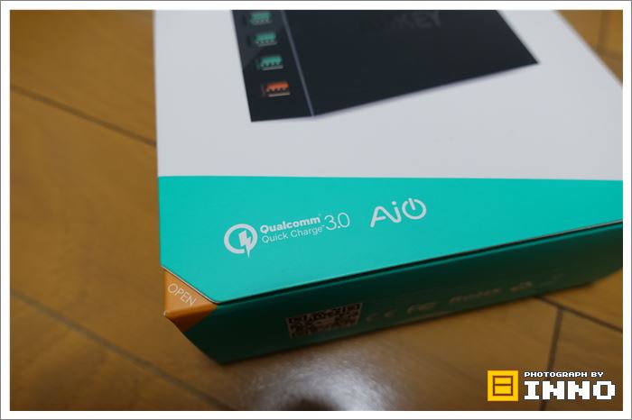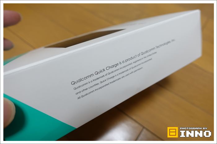 ボックスの前面の下の方にもQuick Charge 3.0(QC3.0)対応と書かれています。